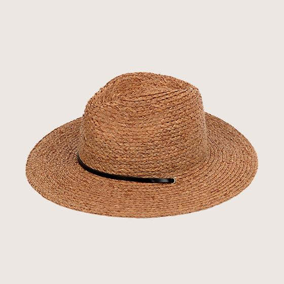 | Inspired by long days under the desert sun. Hand braided from natural raffia straw with a premium dense weave and a double re-enforced brim edge. The specially designed leather chin strap can be used to secure the hat in the wind or can be stowed away under the crown for a cleaner look. |